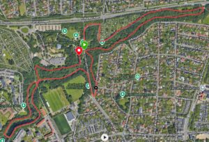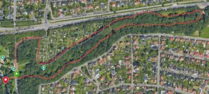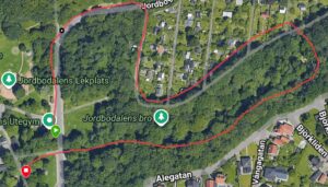 Loppet går på skogsstigar och grusgångar i ett relativt kuperat men naturskönt område i Jordbodalens naturreservat. Knappt 4 km lång rundbana (medsols) som löps två varv för 8 km. Se satellitbild och höjdprofil nedan för respektive distans.