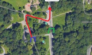 På 8 km loppet fortsätter man förbi målgången på första varvet, över bron och sedan höger ut på banan igen för nästa varv, se bild nedan: